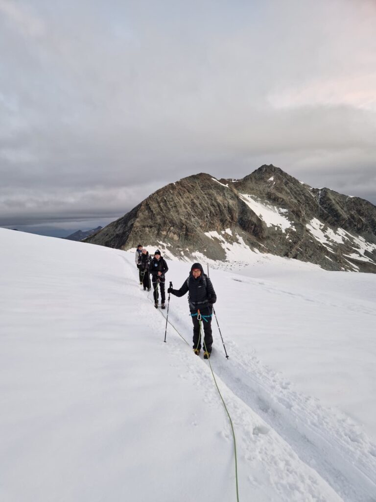 Réveil à 4h30. Sous les étoiles, la famille se prépare et s’encorde pour la montée. Peu à peu, les nuages se dissipent, laissant apparaître un lever de soleil spectaculaire.