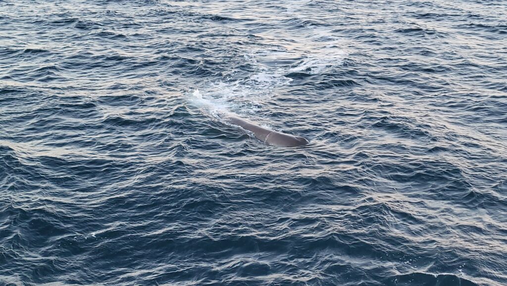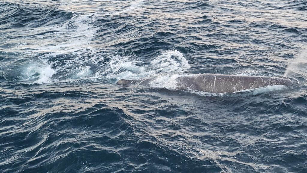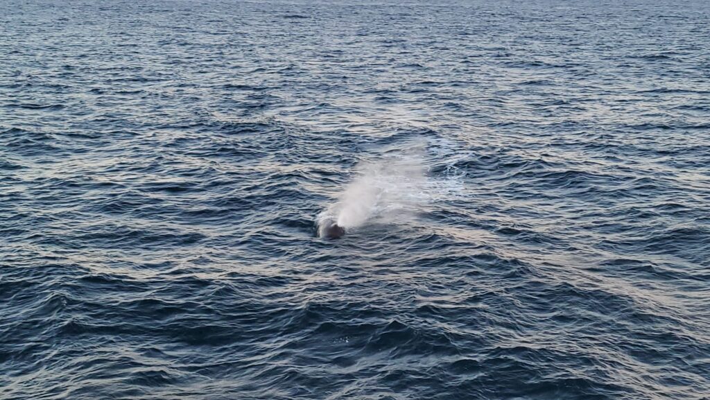 Puis soudain, des jets d’eau à l’horizon. Le bateau avance doucement, respectueusement.